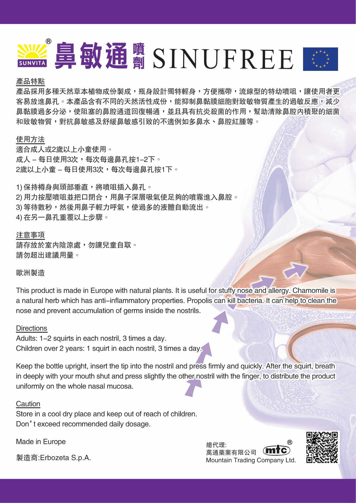 採用多種天然草本植物成份製成,瓶身設計獨特輕身,方便攜帶,流線型的特幼噴咀,讓使用者更客易放進鼻孔。本產品含有不同的天然活性成份,能抑制鼻黏膜細胞對致敏物質產生的過敏反應,減少鼻黏膜過多分泌,使阻塞的鼻腔通道回復暢通,並且具有抗炎殺菌的作用,幫助清除鼻腔內積聚的細菌和致敏物質,對抗鼻敏感及舒緩鼻敏感引致的不適例如多鼻水,鼻腔紅腫等。