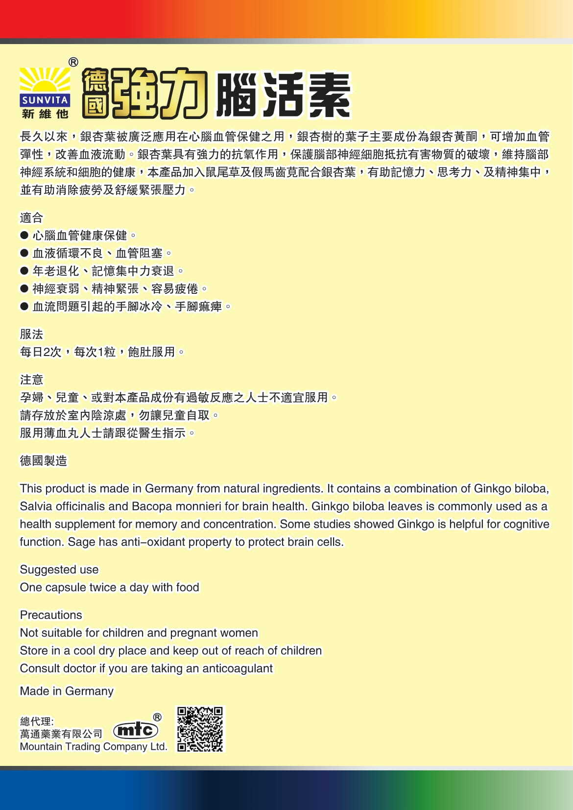 新維他SUNVITA® - 德國強力腦活素 (天然草本配方) -150粒裝